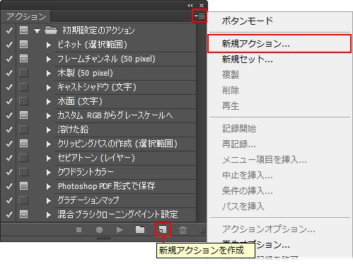アクションパネルの「新規アクションを作成」ボタンをクリックするか、アクションパネルメニューの「新規アクション」を選択します。