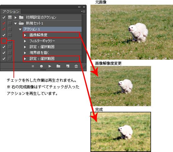 ※ 記録できる操作は、選択、移動、多角形、なげなわ、自動選択、切り抜き、スライス、マジック消しゴム、グラデーション、塗りつぶし、テキスト、シェイプ、注釈、スポイトおよびカラーサンプラーの各ツールで実行する操作、およびヒストリー、スウォッチ、カラー、パス、チャンネル、レイヤー、スタイルおよびアクションの各パネルで実行する操作などです。