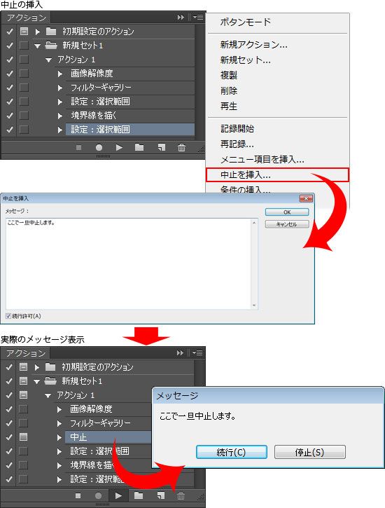 「表示」コマンドやウィンドウメニューのコマンドは記録できません。記録できない作業は、「中止を挿入」を使用して、アクションの途中で必要な作業を手動で追加するようにメッセージを付けて促すことができます。