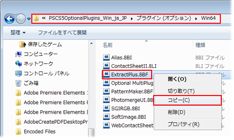 保存したプラグインの以下の場所を開き、「ExtraPlus.8BF」ファイルをコピーします。