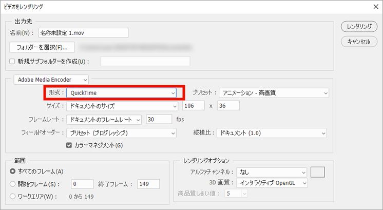 「ビデオをレンダリング」ダイアログボックスで、「形式」プルダウンメニューから「QuickTime」を選択します。
