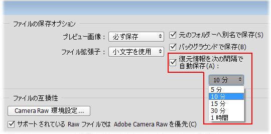 自動保存の設定は、Photoshop の環境設定から変更することができます。編集(Windows)/Photoshop(Mac OS)メニューから環境設定/ファイル管理を選択し、「復元情報を次の間隔で自動保存」のチェックをはずすと機能が無効になります。また、保存の間隔を変更することもできます。(初期設定では 10 分に指定されています。)