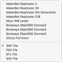 3D プリント設定の指定時に、プリント先:ローカルを選択します。次に、PDF ファイルまたは SVX ファイルをプリンターとして選択します。