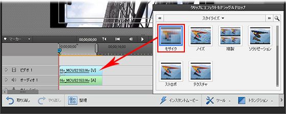 ウィンドウ右下の「エフェクト」をクリックして「モザイク」を選択し、タイムライン上の動画にドラッグして適用します。