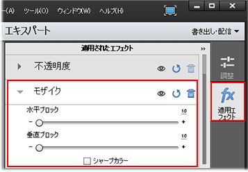 ウィンドウ右側から「適用エフェクト」をクリックし、「モザイク」を開きます。水平ブロックおよび垂直ブロックの値を調整します。