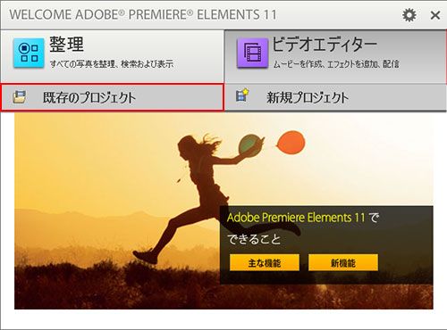 Premiere Elements を起動し、スタートアップ画面で「ビデオエディター」を選択して既存のプロジェクトを開きます。