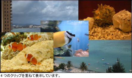 複数のビデオトラックにクリップを配置して映像を重ねることができます。ビデオクリップを重ねて表示する場合、上のトラックにあるビデオクリップが手前に表示されます。オーディオトラックはトラックの順序に関係なく、複数の音声が重なって再生されます。