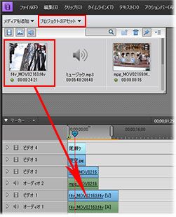 「プロジェクトのアセット」をクリックして、読み込んだクリップをタイムラインに配置します。