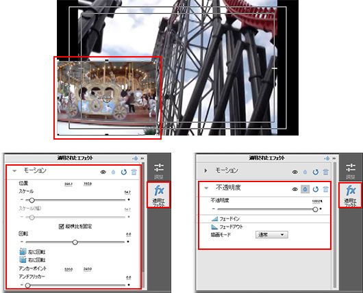 - 「適用エフェクト」をクリックして、「モーション」や「不透明度」プロパティを編集します。
