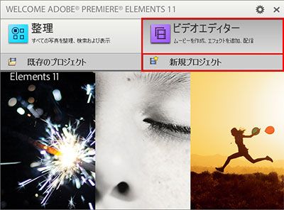 Premiere Elements を起動し、スタートアップ画面で「ビデオエディター」を選択して「新規プロジェクト」を作成します。