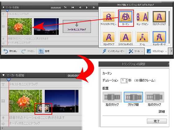 ※ エキスパート編集モードに切り替えると、選択できるトランジションが増えます。トランジションの調整 ダイアログボックスでデュレーションと配置を設定して「完了」をクリックするとトランジションが挿入されます。