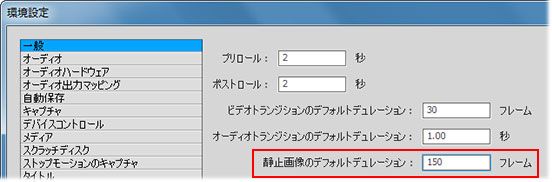 「静止画像のデフォルトのデュレーション」で、静止画のデュレーションの初期設定として設定するフレーム数を指定します。