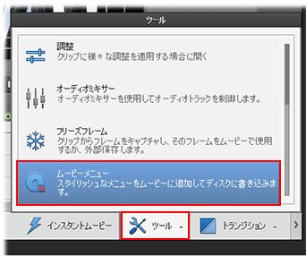 ウィンドウ下部のアクションバーから「ツール」をクリックし、「ムービーメニュー」を選択します。