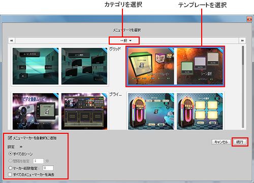 ※ 自動的にメニューマーカーが追加されるようにするには、「メニューマーカーを自動的に追加」を選択します。「設定」をクリックして、オプションを選択します。