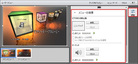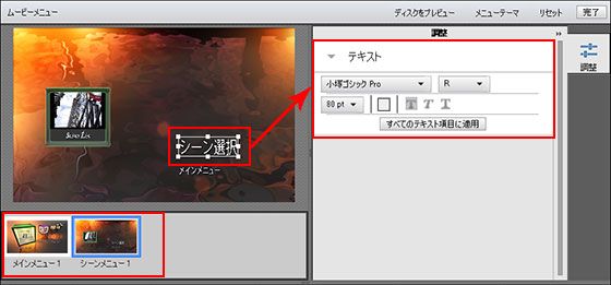 ディスクレイアウトパネルの下部に表示されるメニューのサムネールをクリックして、メニューを表示します。プレビューウィンドウで各要素をクリックすると、編集することができます。