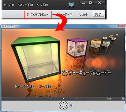 ウィンドウ上部の「ディスクのプレビュー」をクリックすると、プレビュー画面でメニューを確認することができます。