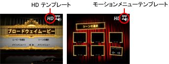 テンプレートには、背景にオーディオ、ビデオ、またはその両方が含まれているモーションテンプレートや、ハイビジョン対応の HD テンプレートがあります。モーションテンプレートや HD テンプレートは、メニューテンプレートの右上の記号で確認できます。