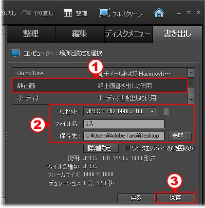 - プリセット : 書き出し元ムービーのサイズに合わせて、[JPEG - HD 1920 x 1080]、[JPEG - HD 1440 x 1080]、[JPEG - NTSC SD] のいずれかを選択します。