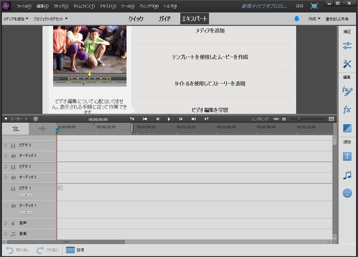 Premiere Elements が起動し、空のプロジェクトが開きます。 ビデオや写真を取り込んでプロジェクトを作成していきましょう。