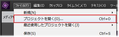 - Premiere Elements が起動した状態で、 [ファイル] メニューの [プロジェクトを開く] をクリックします。