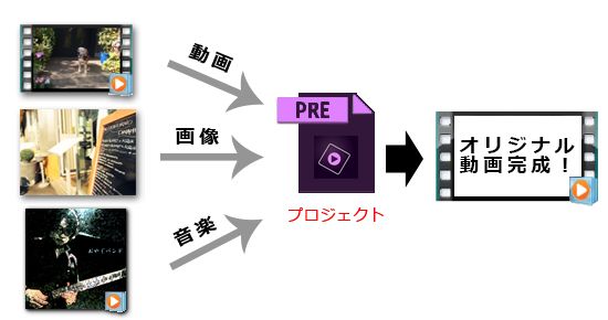 プロジェクトの中でこれらを重ねたり繋げたりして、 そこから最終的なムービーを書き出すという流れになります。