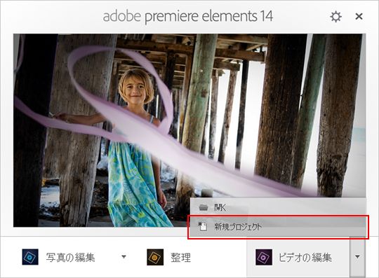 プレミアエレメンツ14のスタートアップスクリーン画面が表示されたら、[ビデオの編集] をクリックし、[新規プロジェクト] をクリックします。