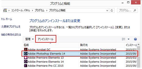 [プログラムと機能] 画面が表示されます。インストールされているプログラムの一覧から [Adobe Photoshop Elements 14] を選択し、[アンインストール] ボタンをクリックします。