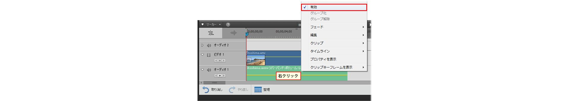 オーディオクリップを右クリックし、表示されたメニューの一覧から [有効] にチェックが入っているので、クリックしてチェックを外します。