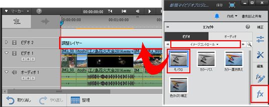 ここでは、ビデオクリップをモノクロにします。画面下の [エフェクト] をクリックし、[イメージコントロール] カテゴリを選択します。[モノクロ] エフェクトを調整レイヤークリップにドラッグ&ドロップします。