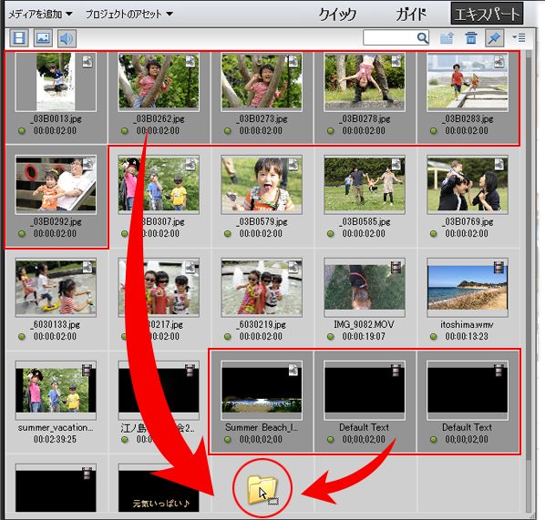 メディアファイルが選択された状態で、作成したフォルダーへドラッグ&ドロップします。