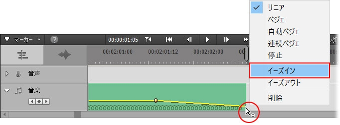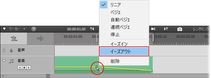 フェードアウト開始のキーフレームにカーソルを合わせ、カーソルの右下に白い丸が表示されたらその状態で右クリックします。表示されたメニューから「イーズアウト」を選択します。