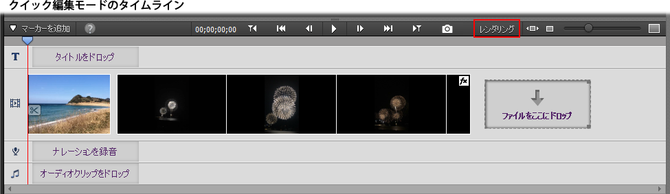 Premiere Elements では、クイックビューおよびエキスパートビュー共に [レンダリング] ボタンをクリックすることでムービー全体をレンダリングすることができます。しかし、長時間のムービーを編集している場合などには予想外に時間がかかることもあります。