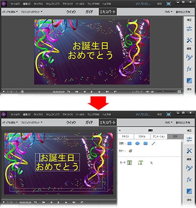 Premiere Elements でタイトル文字や字幕を追加すると、文字のスタイルなどはあらかじめ指定されていますが、これを自由に変更することができます。たくさんのスタイルが用意されているので、好みのデザインに変えてみましょう。