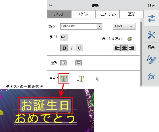 一部の文字を選択する場合は、調整パネルのモードセクションにある「文字ツール」で該当箇所をドラッグして選択します。