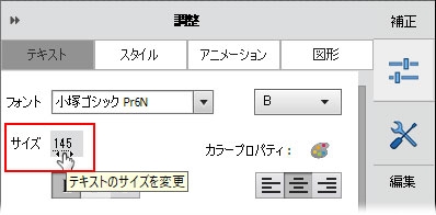 文字を選択している状態で、「テキスト」タブのサイズの値を変更します。数値上にマウスポインターを置いて手のアイコンに変わったらそのまま左右にドラッグして値を調節します。