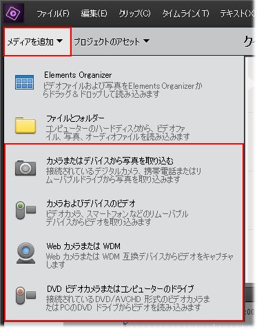 カメラから Premiere Elements に映像や画像を取り込むには、以下の操作を行います。