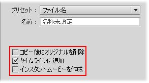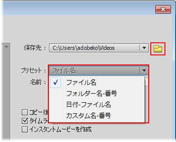 必要に応じて保存先を指定し、動画ファイルの名前を「プリセット」のプルダウンリストから選択します。