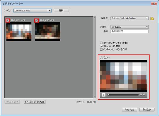 ビデオインポーターダイアログボックスが表示されたら、取り込む動画にチェックを入れます。動画は右下のプレビューで確認することができます。