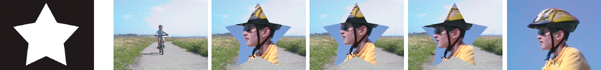 モノクロのビットマップ画像をトランジションマスクとして使用できます。この場合、最初のクリップが画像の黒の領域を置き換え、2 番目のクリップが画像の白の領域を置き換えます。マスクにグレースケール画像を使用すると、50 % 以上のグレーを含んでいるピクセルは黒に変換され、50 % 未満のグレーを含んでいるピクセルは白に変換されます。
