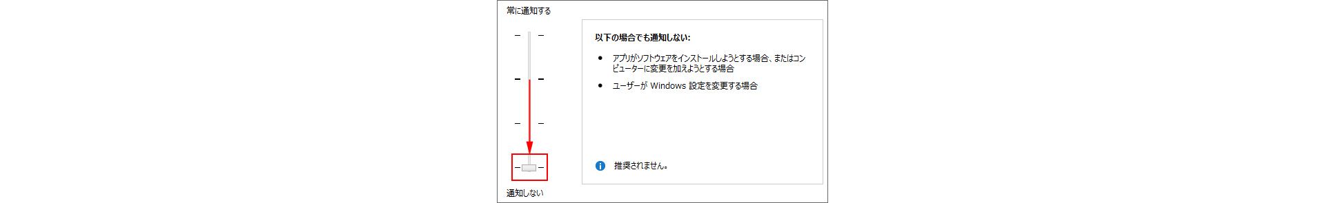 「コンピューターに対する変更の通知を受け取るタイミングの選択」画面が表示されたら、スライダを下にドラッグして「通知しない」に設定します。