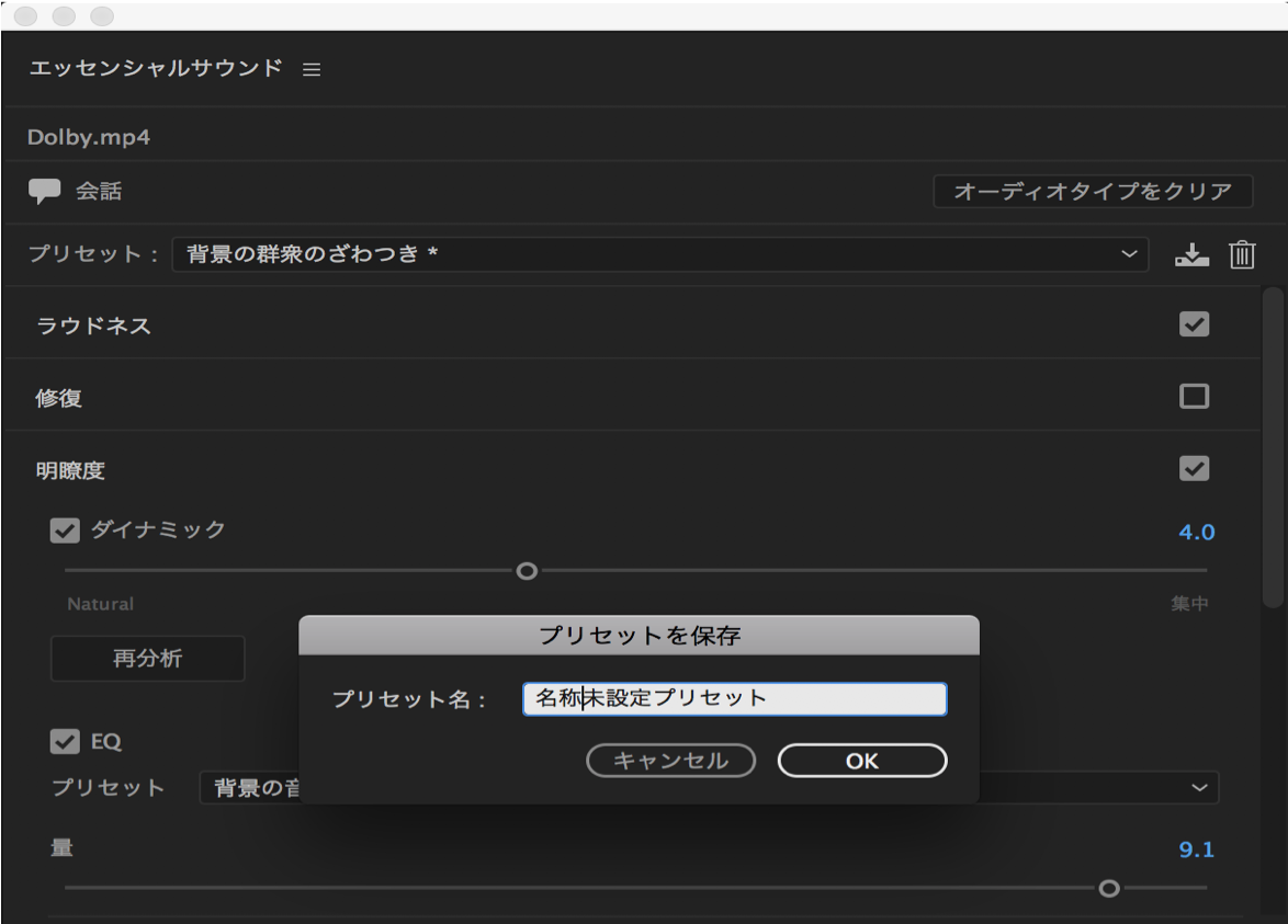 Essential Soundパネルは、オーディオのミキシングと強化のための合理化されたインターフェイスを提供します。 以下のことができます: