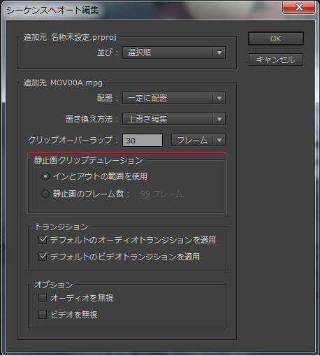 これを行うには、シーケンスへオート編集ダイアログの 「静止画クリップデュレーション」で、 「静止画のフレーム数」を選択し、フレーム数を入力します。