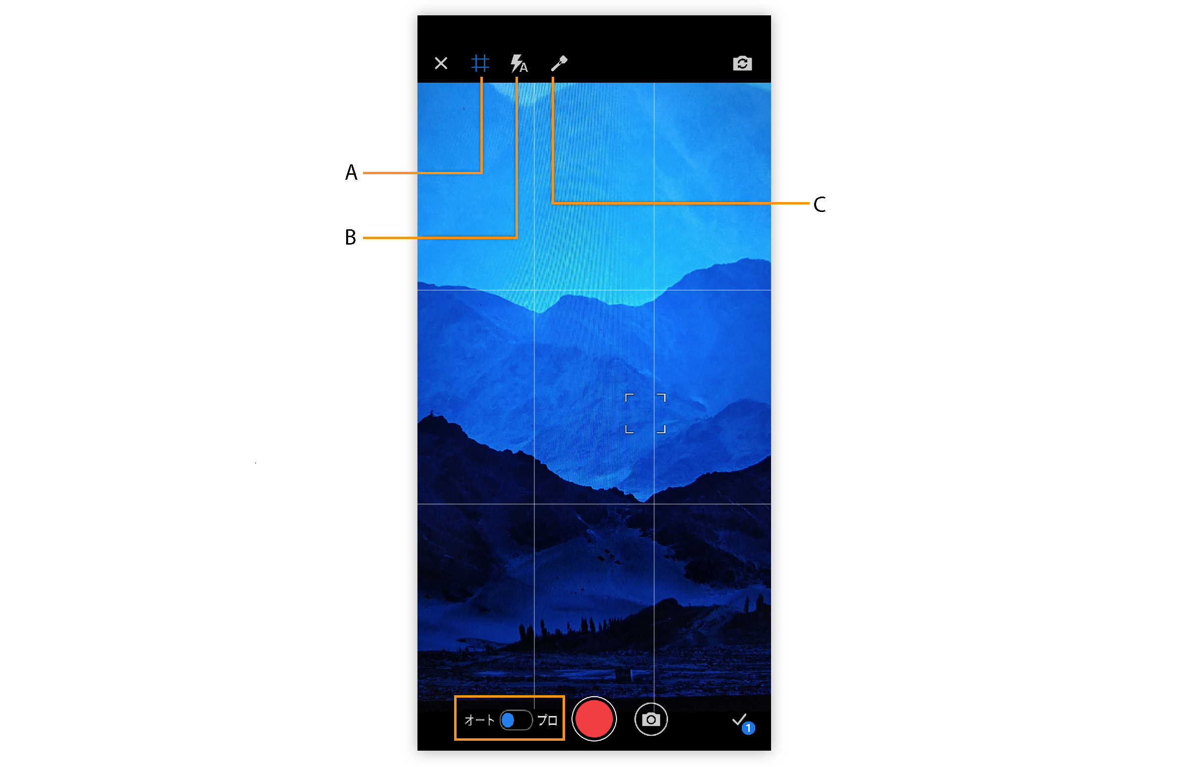 基本的な撮影コントロールには、「自動」モードを使用できます。 シャッタースピード、ホワイトバランス、解像度、フレームレート、ISO などの詳細な設定をおこなう場合は、「プロ」モードに切り替えます。 カメラ設定について詳しくは、撮影オプションを参照してください。