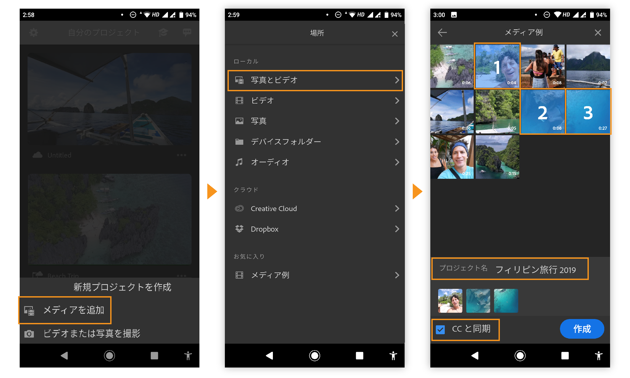 次に、「メディアを追加」を選択して、お使いのデバイス、Creative Cloud または Dropbox にある撮影済みのメディアを使用できます。 または、「ビデオまたは写真を撮影」をタップして、新規プロジェクト向けに写真やビデオを直接撮影することができます。