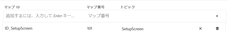 トピック:マップ ID とマップ番号に対して、トピックの割り当てと割り当て解除を行うことができます。例えば、トピック名として「SetupScreen」などを指定します。