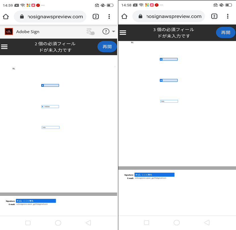 | 4549103 | 概要:送信者が無効なメールアドレスの受信者を有効なメールアドレスに置き換えた後、以前に不正だった受信者に対してメールバウンスイベントが再度ログに記録される場合があります。場合によっては、監査証跡に古い電子メールの 2 回目のバウンスイベントが表示され、新しい受信者が正常に契約書を受信、表示または署名しているにもかかわらず、契約書ステータスに「電子メールが戻ってきました」と反映されることがあります。この動作により、契約書が古いメールアドレスと新しいメールアドレスの両方を対象にしているように見える場合があります。 |
