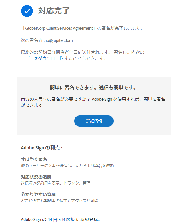 - 契約書の内容と署名済み契約書を含むカスタム電子メール通知の送信