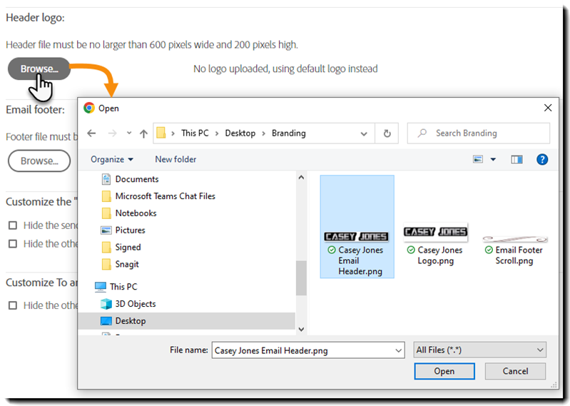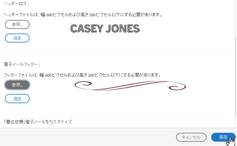 アップロードしたヘッダー画像は、Acrobat Sign から受信者に送信される電子メールテンプレートの一番上に表示されます。フッター画像は一番下に表示されます。