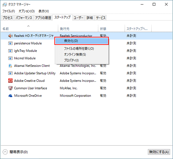 Windows 起動時に読み込まれるプログラムの一覧が表示されます。各項目を右クリックし、「無効化」を選択します。すべての項目を無効にしたらタスクマネージャーを閉じます。