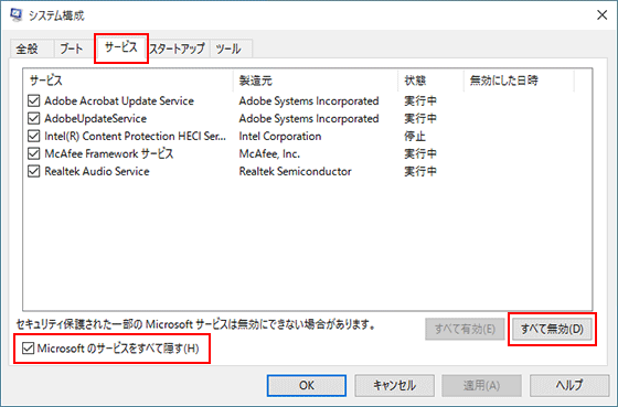 「サービス」タブを開き、「Microsoft のサービスを全て隠す」にチェックを入れた後、「すべて無効」ボタンをクリックします。